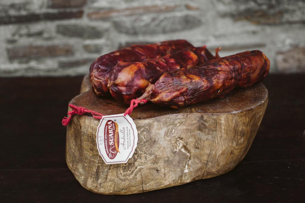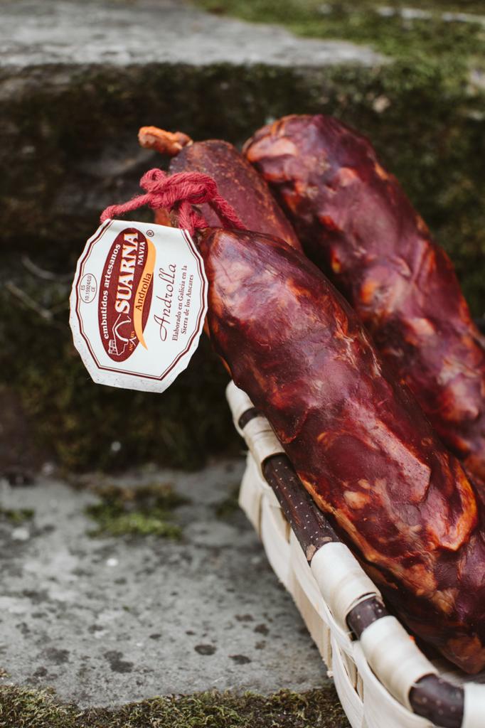 Este embutido tradicional de Navia de Suarna se caracteriza por su sabor intenso a adobo y ahumado. La androlla es un producto que consigue trasladar a tu plato el gusto más auténtico de una elaboración tradicional.