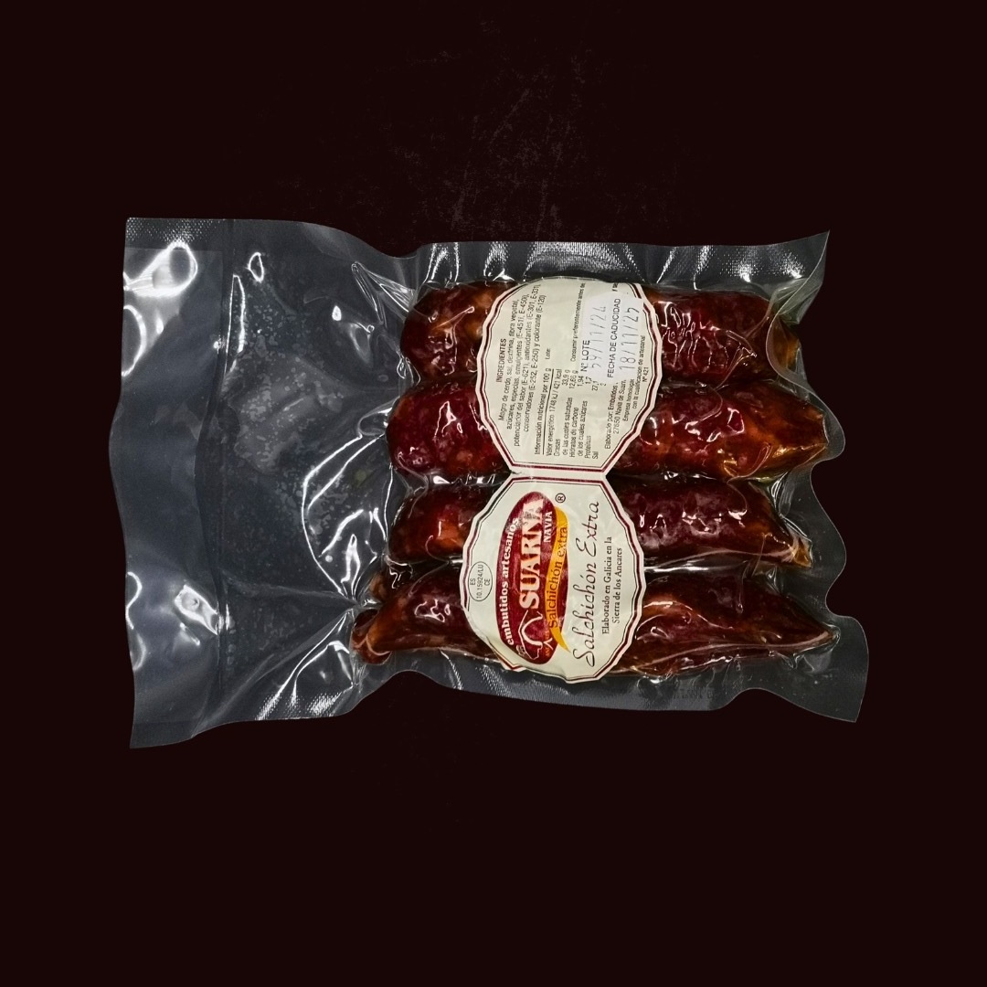 Envasado al vacío en cómodas unidades de cuatro, es ideal para llevar contigo, compartir en reuniones o disfrutar de manera individual. Perfecto para combinar con queso, pan o simplemente como un aperitivo, este mini salchichón es una celebración del buen hacer gallego en un formato versátil y accesible.